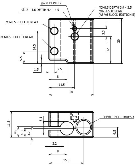 As clearly illustrated in the diagram, the Volcano heating block significantly exceeds the dimensions of the standard heating blocks used in many models of 3D printers. This heating block is made from aluminum, measuring 20 mm on each side and 11.5 mm in height. It features two holes with a diameter of 6 mm for installing the ceramic heater and threaded holes for screwing in the nozzle and thermobarrier tube. Additionally, there is a 2 mm diameter hole for the thermistor. The side of the heating element hole has a through slot to ensure a more secure fit for the heating element.