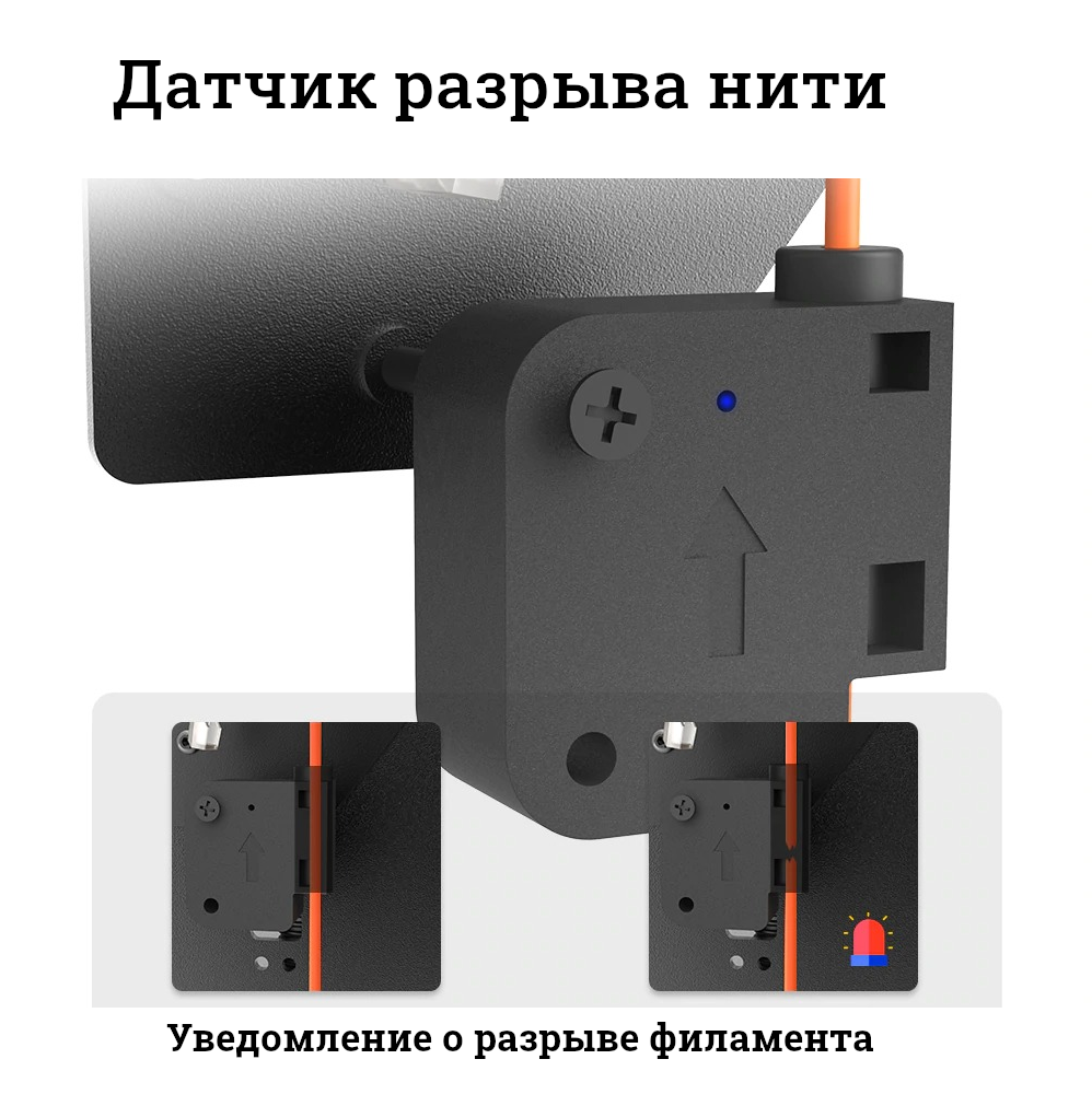 Датчик разрыва нити филамента – эта система контроля подачи пластика уведомит вас об ошибке, при аварийном обрыве или окончании филамента. Таким образом, если возникнет проблема с подачей пластика, принтер не будет “печатать воздухом”, а остановит печать;