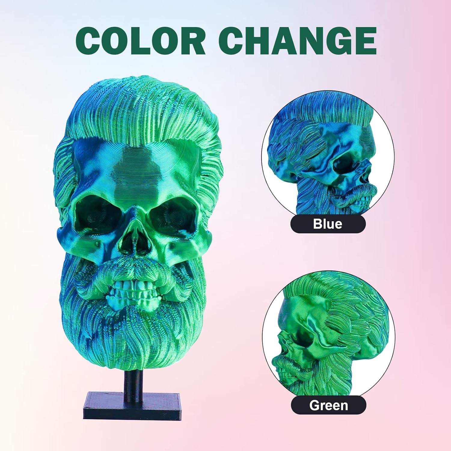 Главное преимущество филамента – его двухцветный эффект. Плавные переходы от синего к зеленому создают уникальный визуальный эффект, который варьируется в зависимости от угла обзора. Модели, напечатанные с этим филаментом, приобретают шелковистый блеск, что делает его идеальным для создания художественных и декоративных предметов.Блеск и плавность цветовых переходов особенно хорошо проявляются на моделях с изогнутыми или сложными формами, делая каждое изделие уникальным.