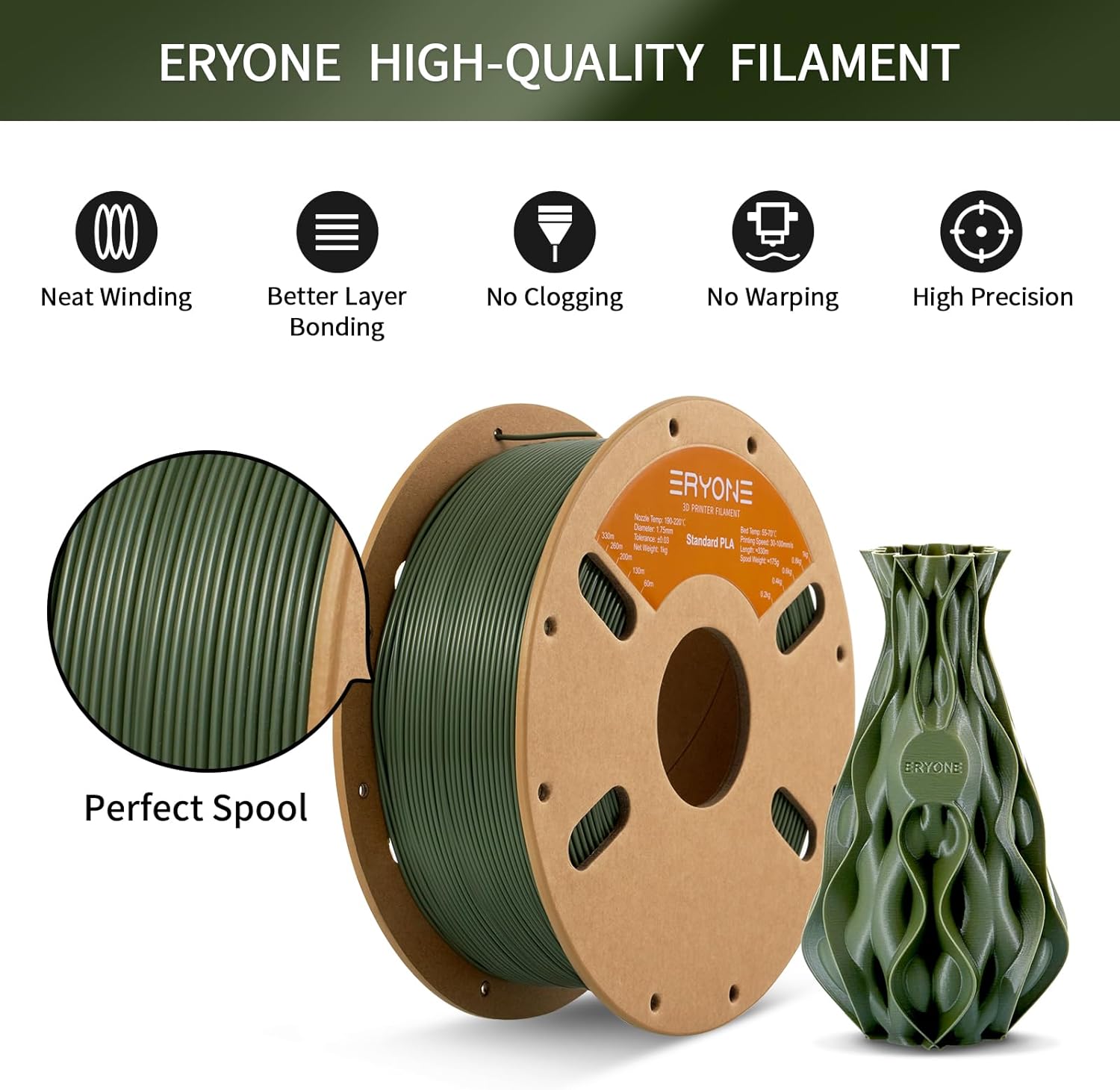 Филамент ERYONE PLA Standard в цвете Army Green — отличный выбор для пользователей 3D-принтеров, предлагающий стабильную печать и привлекательный внешний вид готовых изделий. Этот PLA-пластик подходит как новичкам, так и опытным пользователям, гарантируя простоту использования и высокое качество.