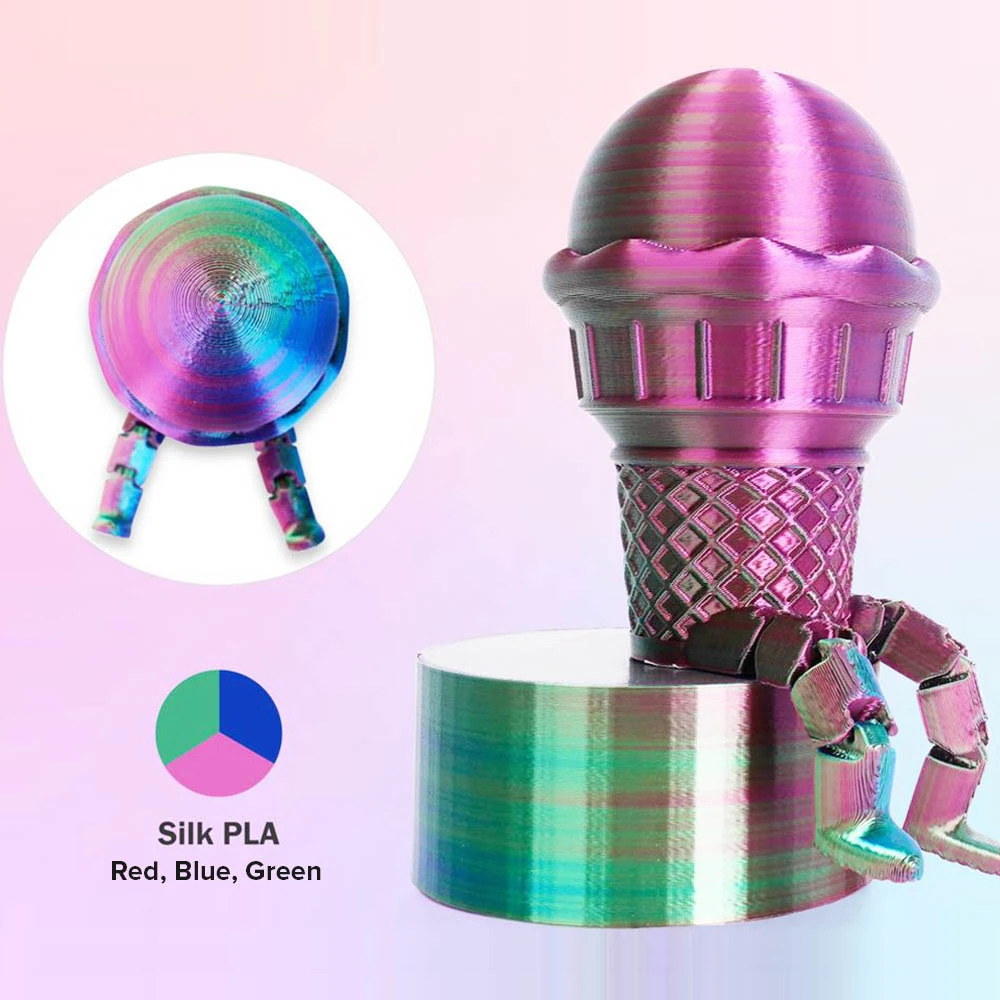 ERYONE Silk Tri-Color PLA — это сочетание простоты печати и уникальных визуальных эффектов. Его трёхцветный градиент и шелковистый блеск делают его идеальным для создания впечатляющих моделей, которые выделяются на фоне стандартных решений.