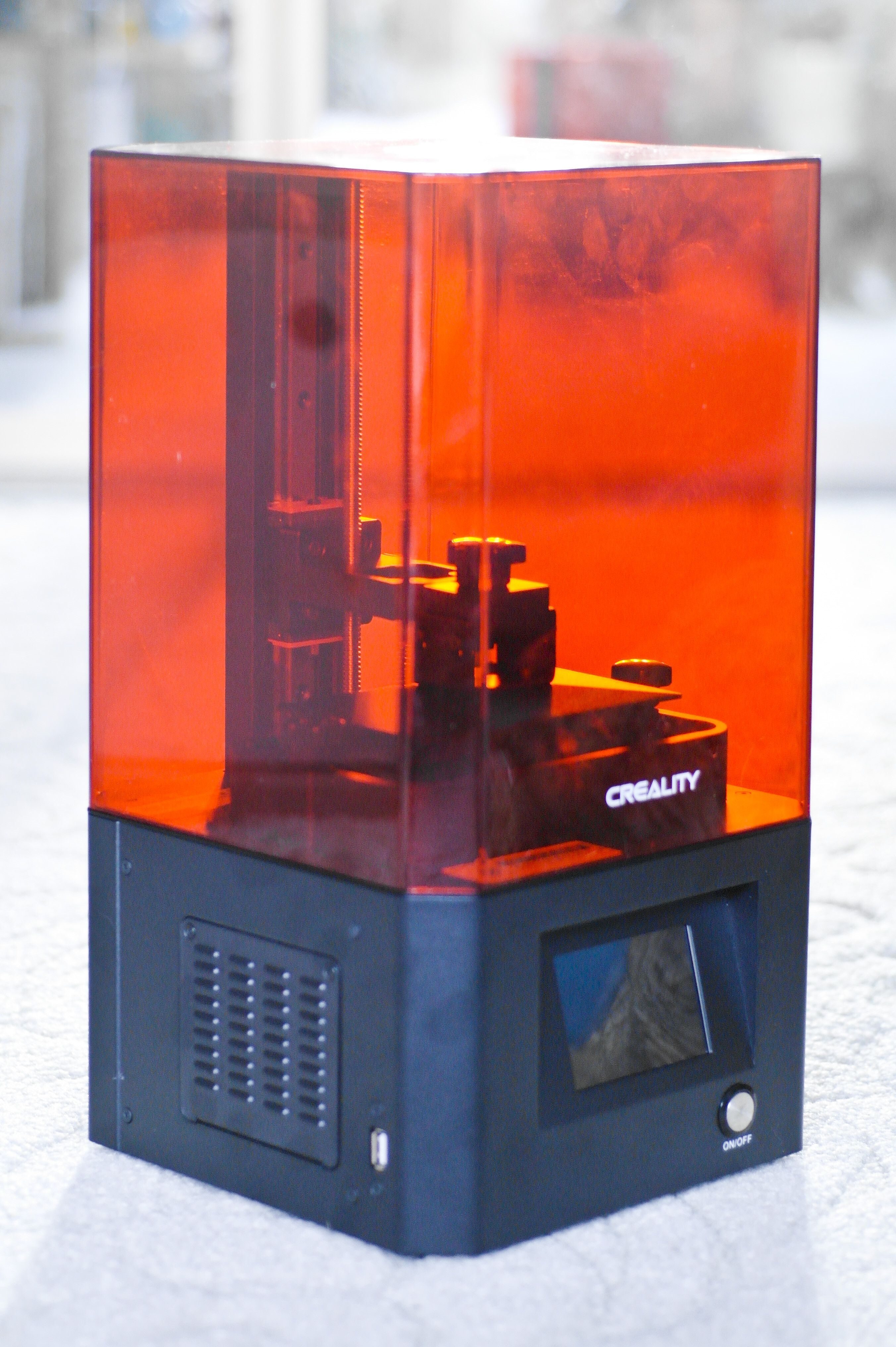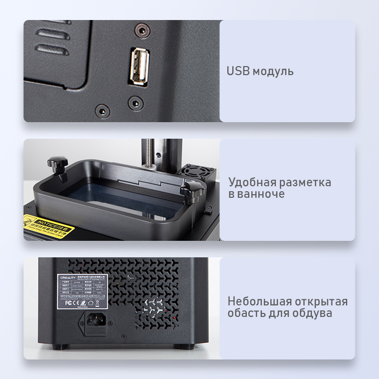 Конструкция принтера достаточно стандартная, как для линейки Creality – в металлическом тяжелом основании расположены электронные составляющие, блок фильтрации воздуха, модуль УФ засветки, на внешней задней панели установлены все порты подключения, а на передней кнопка питания и сенсорный экран управления. Для устойчивости во время печати, принтер стоит на четырех прорезиненных ножках. Сверху над экраном устанавливается металлический Vat-контейнер, с нанесенной внутри разметкой, для контроля над уровнем смолы. Он крепится на два винта и удобно снимается при необходимости. Защиту экрана засветки от царапин и повреждений, обеспечивается FEP-пленка, которая натягивается на дне Vat-контейнера.