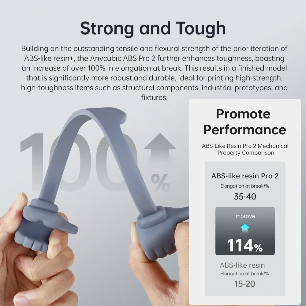 В отличие от более ранних версий ABS-like resin + и подобных фотополимерных смол, Anycubic ABS Like Pro 2 имеет значительно улучшенные показатели прочности и увеличенное сопротивление на разрыв и деформацию.