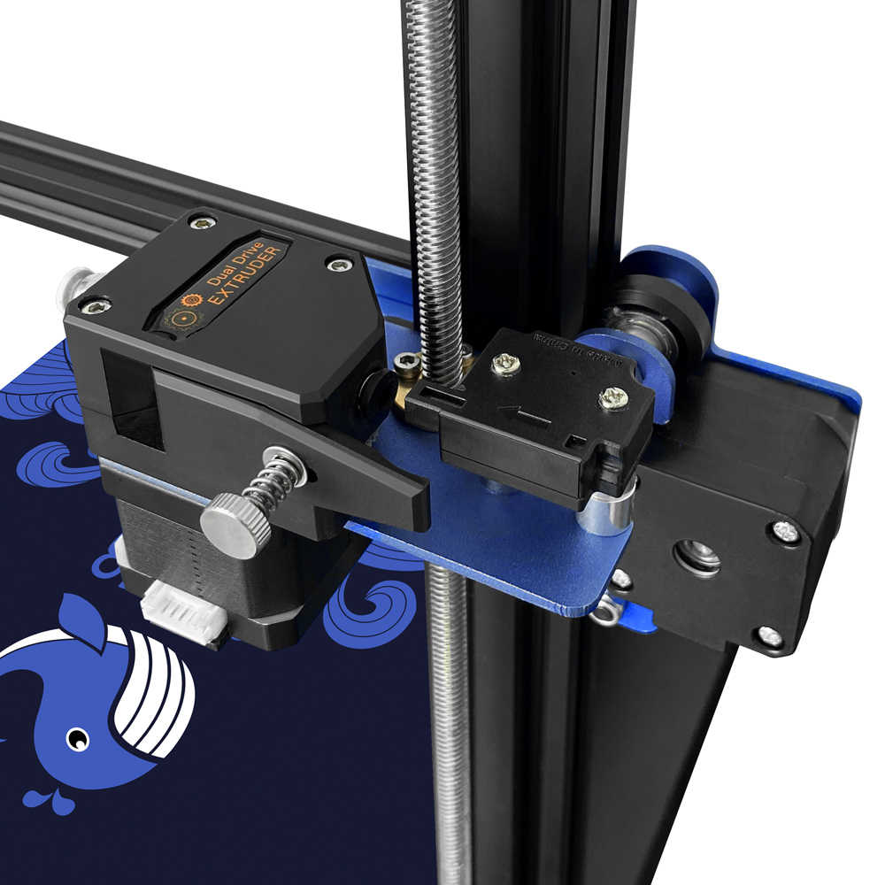 Для подачі пластику використовується прозорий екструдер BMG, з подвійними шестернями, для кращого притиску пластику та потужної, стабільної екструзії, підтримки різноманітних витратних матеріалів для друку та забезпечення плавної подачі. Завдяки використанню такого механізму доступний друк філаментами PLA, ABS, PETG, Wooden Filament та іншими, включаючи гнучкі нитки.
